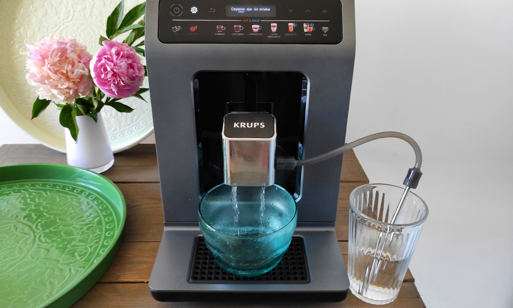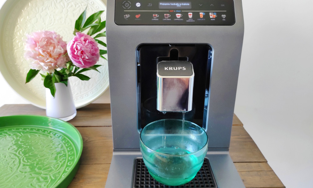 Po dwóch tygodniach testów mogę śmiało powiedzieć: Krups Evidence Hot & Cold nie tylko parzy świetne kawy, ale też wyjątkowo dba o swoją higienę. Jego automatyczne programy płukania uruchamiają się w kluczowych momentach – po pierwszym włączeniu, po przygotowaniu kaw mlecznych, a także przed wyłączeniem ekspresu (jeśli tylko ustawimy taką opcję w menu).
