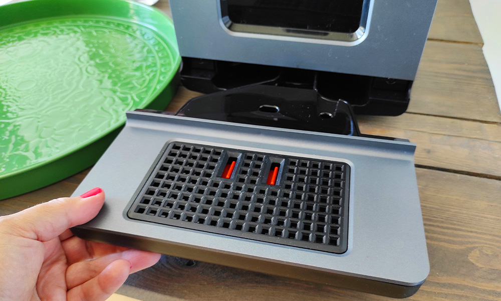 Zbiornik na wodę, choć ulokowany z tyłu, nie sprawia trudności przy wyjmowaniu i wstawianiu. Został wyposażony w ergonomiczną rączkę, pełniącą jednocześnie funkcję przykrywki. Mieści 2,5 l wody – całkiem dużo jak na naczynie o dość wąskim profilu.
