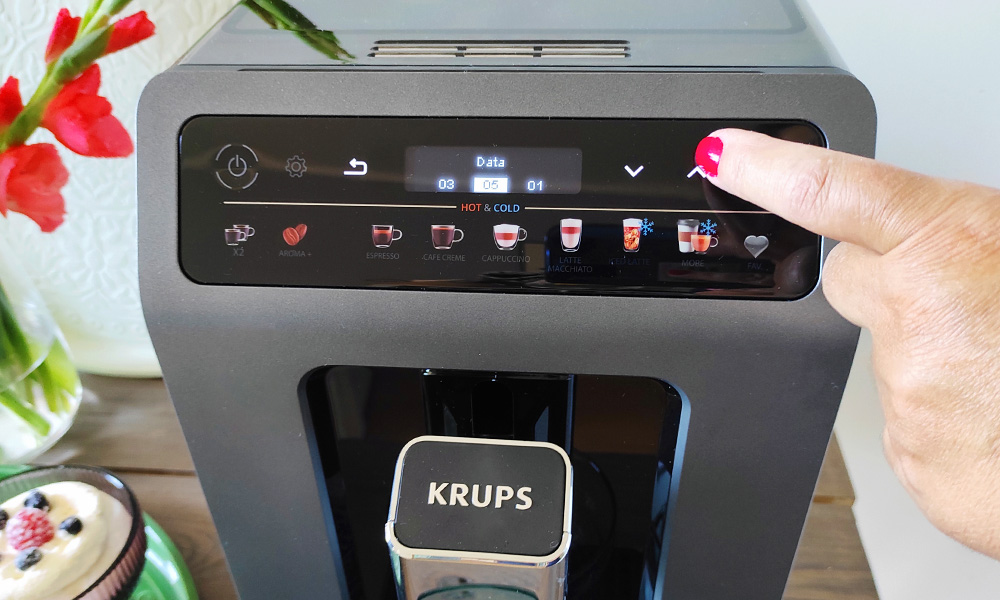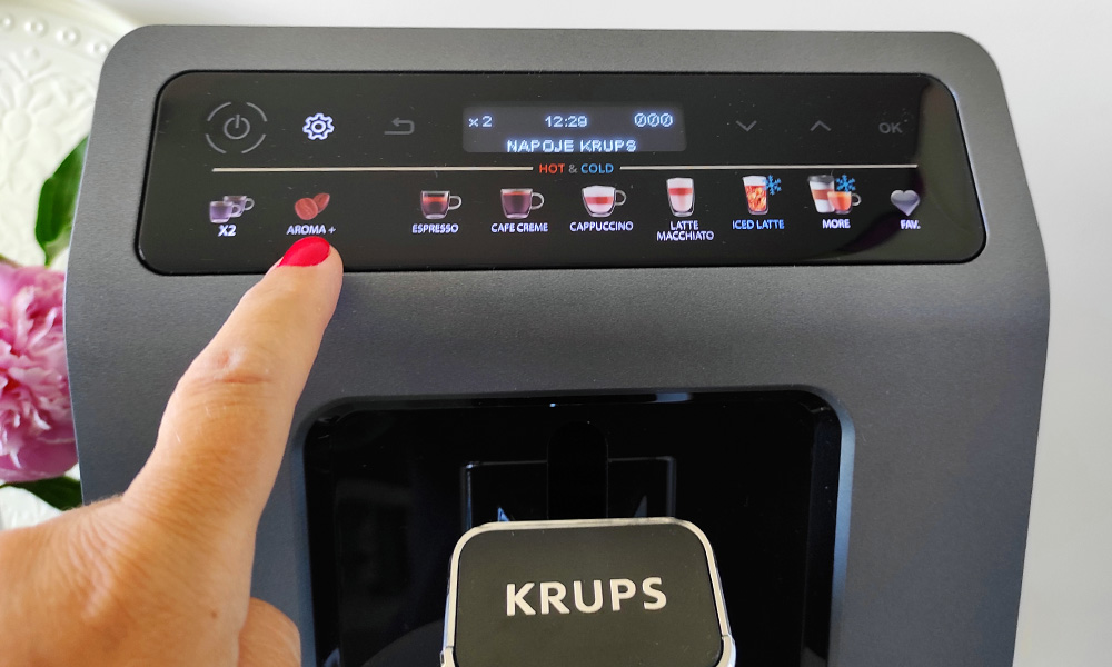 Testowanie ekspresu Krups zaczęłam klasycznie – od espresso. Na panelu dotykowym nacisnęłam ikonę filiżanki z nazwą tej kawy. Za pomocą przycisku Aroma + wybrałam też intensywność napoju (w zależności od liczby kliknięć na wyświetlaczu pojawiały się jedno, dwa albo trzy ziarenka kawy; przy czym jedno oznacza napój delikatny, a trzy – mocny, bardziej skoncentrowany). Postawiłam na delikatność. Potem przycisk OK i… kilka chwil dla urządzenia na podgrzanie wody oraz zmielenie ziaren (dość ciche jak na młynek elektryczny). Dopiero w trakcie przygotowania napoju – gdy z dysz popłynął ciemny, gęsty strumień kawy i podświetliły się strzałki góra/dół na wyświetlaczu – można było dopasować wielkość espresso do swoich potrzeb. Pierwsza myśl – trochę mało czasu na wybór, a ja nie znam wielkości filiżanki. Ustawiłam więc na chybił trafił 50 ml, co okazało się dobrym wyborem. A także wskazówką na przyszłość, że warto sprawdzać objętości ulubionych kubków, szklanek, filiżanek.