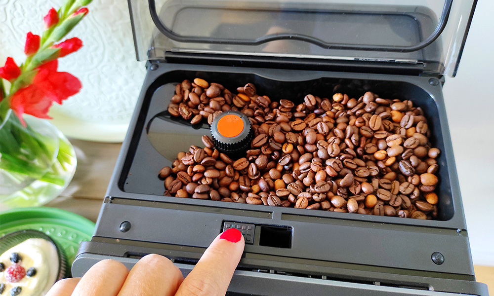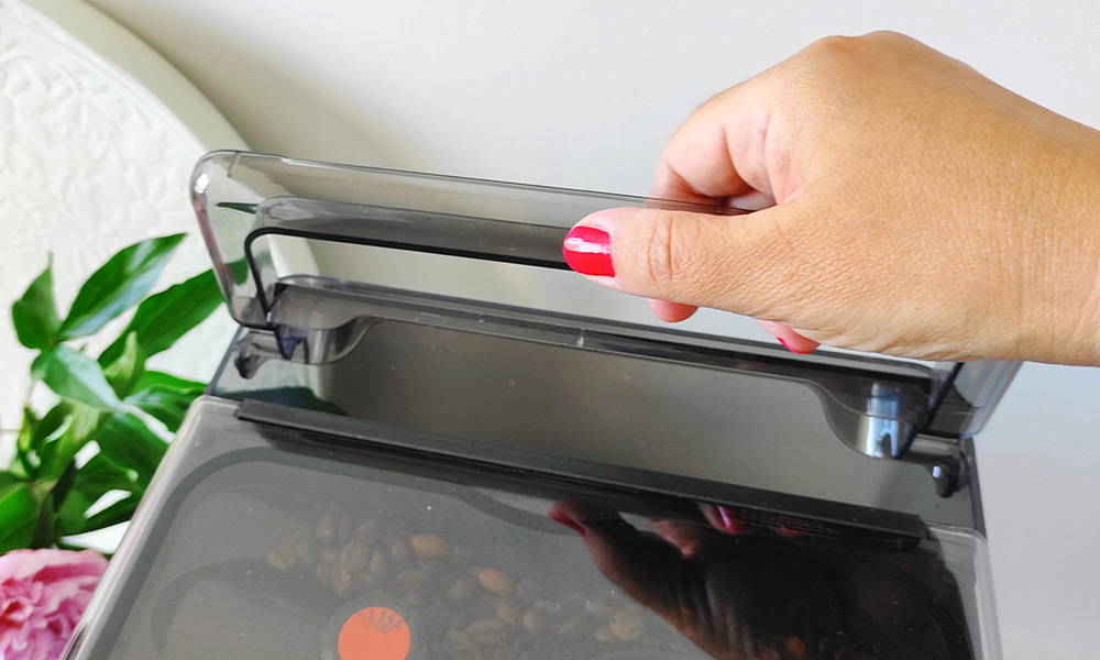 Kawę wsypujemy do zbiornika na górze ekspresu – pojemnego, przygotowanego na 260 g ziaren, zabezpieczonego szczelną pokrywką. Uwaga: ekspres nie obsługuje kawy mielonej. Mały otwór z klapką umieszczony przed pojemnikiem służy wyłącznie do dozowania tabletki czyszczącej (przy uruchamianiu programu konserwacyjnego).