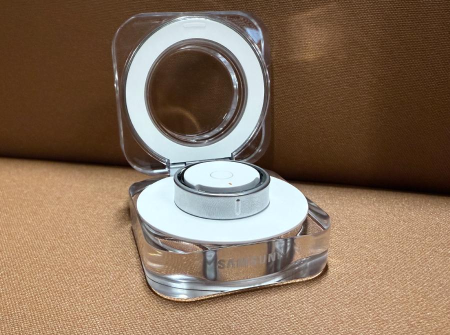 W zestawie z Galaxy Ring otrzymujemy całkiem eleganckie, niewielkie, przezroczyste plastikowe etui z logo Samsung – w nim pierścień może być przechowywany i tam też się ładuje. Po podłączeniu kabelka (którego niestety w zestawie nie dostajemy i musimy go sobie załatwić na własną rękę) do portu USB-C z tyłu etui. W pełni naładowana bateria pierścienia wystarczy według firmy Samsung na 7 dni użytkowania Galaxy Ring na jednym ładowaniu (w testowanym rozmiarze 13). W moim przypadku było to 9 dni, z tym że codziennie zdejmowałem go na miej więcej 1–2 godziny i raz nie założyłem go na noc. Jak na tak niewielkie urządzenie jest to bardzo zacny czas działania.