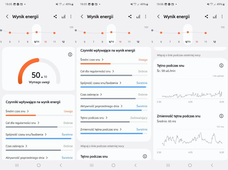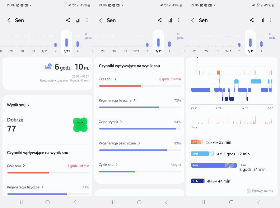 Jeśli mamy Galaxy Ring założony w czasie spania, co w żaden sposób nie powoduje dyskomfortu, to otrzymamy także Wynik snu – przygotowany na podobnej zasadzie jak w przypadku Wyniku energii. Gdy śpimy, Galaxy Ring analizuje także poziom tlenu we krwi, temperaturę skóry, puls czy częstość oddechów. Przygotowuje informacje o poszczególnych fazach snu, a także może wykrywać chrapanie.