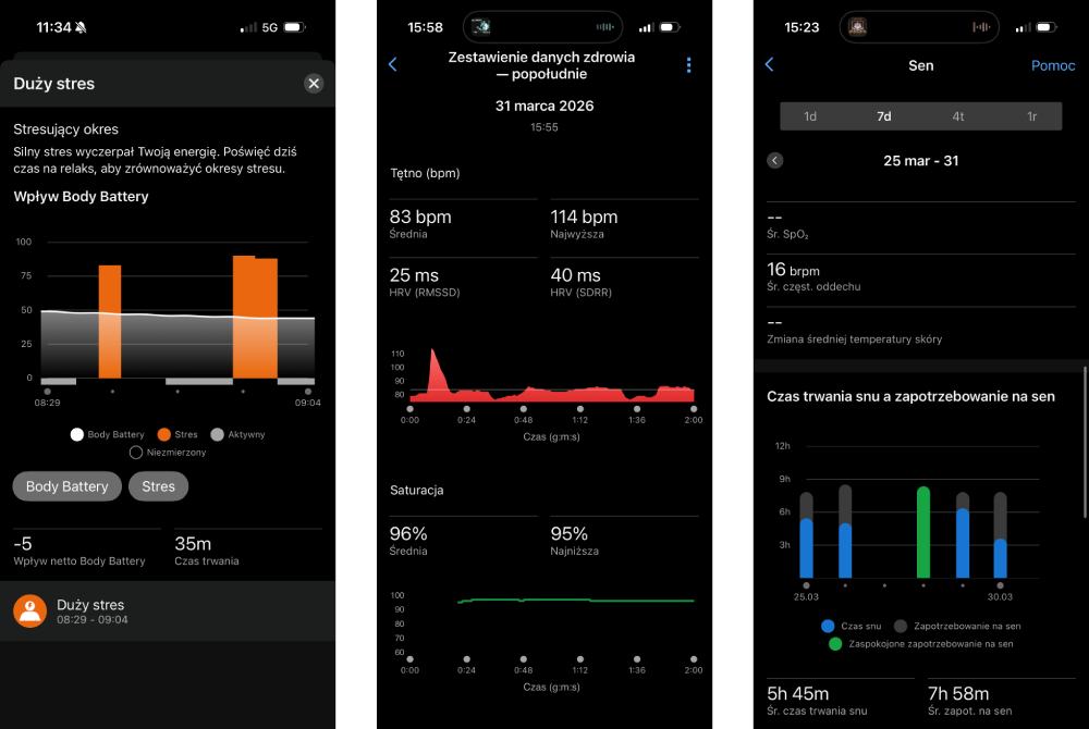 Bardzo dobrze wypada monitoring snu. Garmin nie ogranicza się do prostego zliczania godzin, ale pokazuje jakość odpoczynku i jego wpływ na samopoczucie w ciągu dnia. To cenne informacje dla osób, które chcą zadbać nie tylko o aktywność, ale też o odpowiednią regenerację.