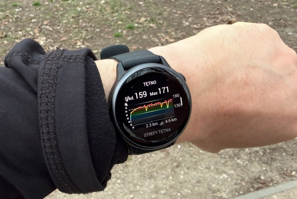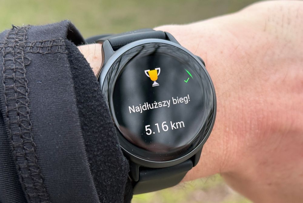 Dla mnie najważniejsza była jednak czytelność w pełnym słońcu. Podczas biegania w bezchmurny dzień nie musiałem zasłaniać wyświetlacza vívoactive 6 ręką, by odczytać tempo czy tętno. Jasność panelu adaptuje się do warunków otoczenia, więc wieczorem ekran nie raził w oczy, a w dzień pozostawał w pełni wyraźny.