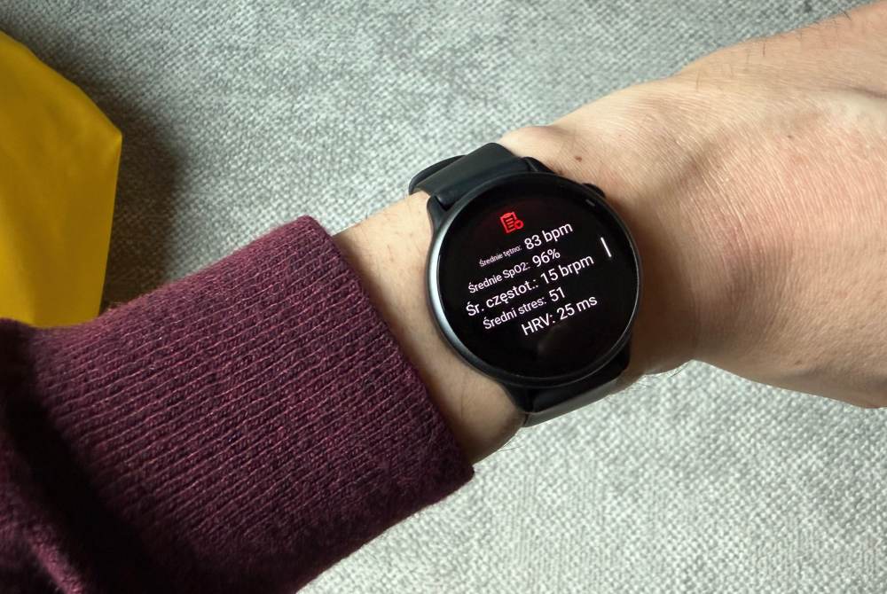- HRV (zmienność rytmu serca) – kluczowy wskaźnik regeneracji i stresu; w teście zegarek pokazywał HRV RMSSD i SDRR