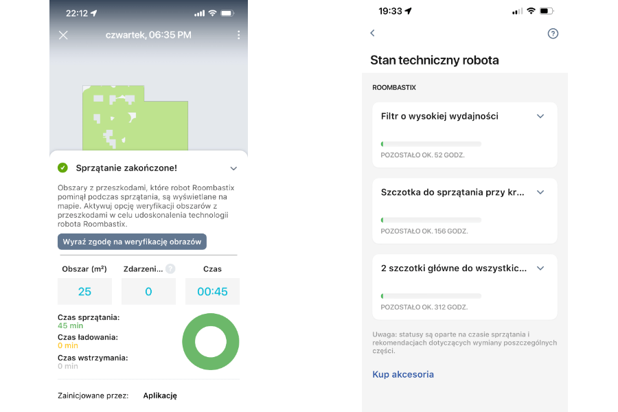 Aplikacja poinformuje cię, kiedy nadejdzie czas na wymianę części. Możesz również utworzyć harmonogram uruchamiania robota, a także dostosować jego działanie, gdy pojemnik na kurz będzie pełny. Funkcja, która umożliwia pokazywanie zdjęć zrobionych przez Roombę, okazała się niezwykle przydatna.