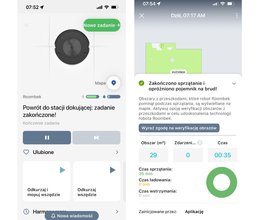 A jak radzi sobie z omijaniem przeszkód? Dzięki kamerze wszystkie dobrze widoczne przeszkody omija bez problemu, czasami tylko zdarza mu się obijać, np. o nogi krzeseł lub stołu. Roomba Combo j7+ wykryje też i ominie nieczystości pozostawione przez zwierzęta, powinien więc być odpowiednim wyborem dla właścicieli czworonogów. Jeśli włączyliśmy funkcję rejestrowania omijanych przeszkód, to po skończonej pracy dostępne będą w aplikacji zdjęcia przeszkód napotkanych przez robota podczas sprzątania. Możemy zdecydować, czy dany przedmiot ma być ignorowany, czy omijany podczas kolejnego sprzątania.