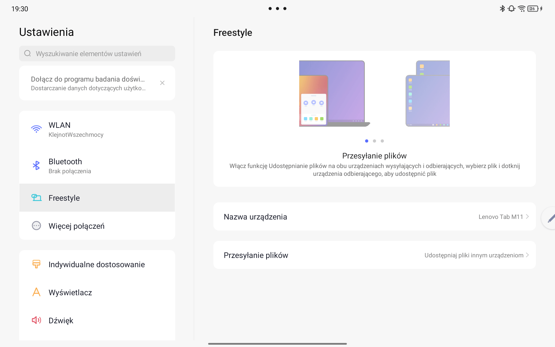 Aplikacja Freestyle dostępna jest w Microsoft Store i można ją pobrać bez względu na to, czy komputer jest produkcji Lenovo, czy też nie. Niestety, próby sprawdzenia praktycznego Freestyle się nie powiodły – mimo obecności stosownych ustawień w systemie Tab M11 i zalogowania się na tablecie tym samym Lenovo ID co na komputerze, mój PC nie był w stanie wykryć tabletu. Pomysł jest w każdym razie obiecujący.