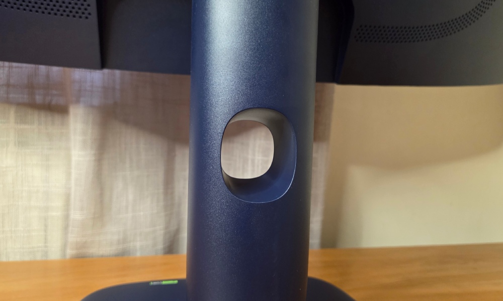 Zdecydowanie najbardziej w oczy rzuca się jednak podstawa AW3425DW. Muszę przyznać, że po raz pierwszy widzę ten element zaprojektowany w taki sposób. Nóżka jest ergonomicznie wyprofilowana, a na jej środku znajduje się otwór, przez który można przeciągnąć kable. Ja sam zdecydowałem się zawiesić monitor, jednak gdyby nie specyfika stanowiska, to nie miałbym żadnych oporów, żeby w ten sposób wyglądająca podstawa zdobiła moje biurko.