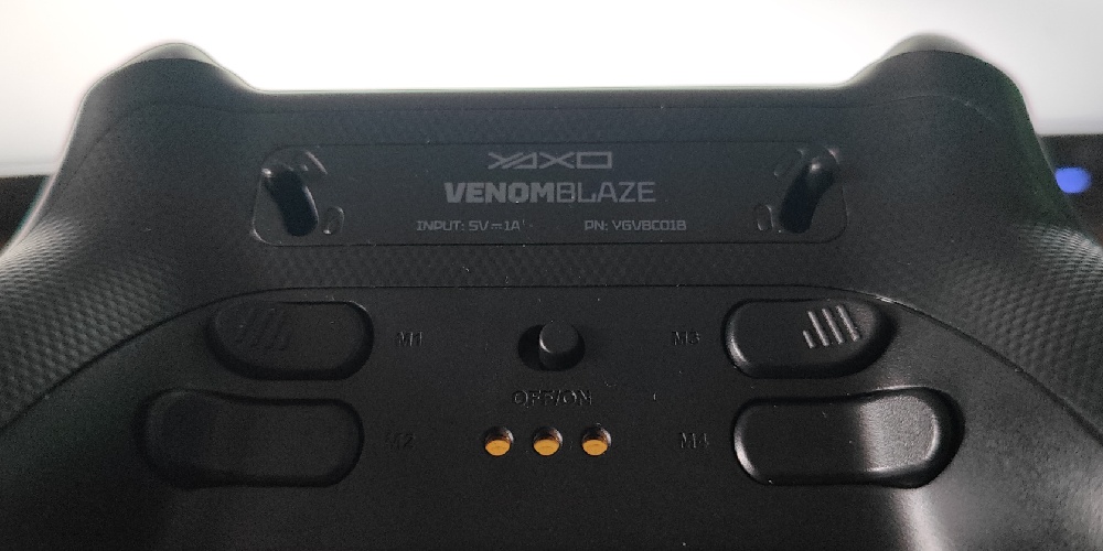 Ten podtytuł nie jest podszyty metaforą, chociaż w pewnym sensie mógłby być. Mam tu jednak na myśli dosłownie spodnią część kontrolera, na której wielu producentów umieszcza całkiem sporo ciekawych elementów. W przypadku Yaxo Venom Blaze znalazły się tutaj dwa przełączniki pozwalające spłycić skok triggerów, cztery w pełni konfigurowalne przyciski (ich funkcje można ustawić z poziomu menu ekranowego) oraz klasyczny przełącznik zasilania.