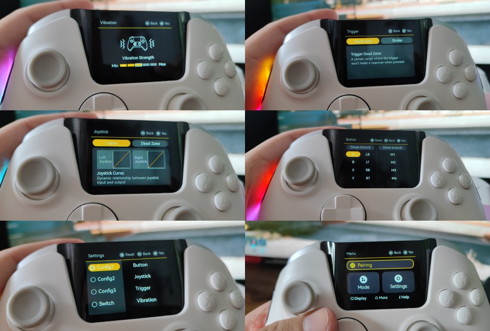 Pierwszą rzeczą, na którą wielu z was zwróci uwagę, jest obecność ekranu na środku kontrolera. Niektórzy pewnie będą się zastanawiać: po co w ogóle ekran w padzie? Odpowiedź okazuje się całkiem prosta – zamiast żonglować skrótami klawiszowymi albo instalować dodatkowe oprogramowanie na PC, wszystkie najważniejsze ustawienia mamy tutaj zawsze pod ręką. Od wcześniej wspomnianej kalibracji analogów i konfiguracji dodatkowych przycisków po przełączanie i dostosowywanie własnych profili. Jest to zaskakująco funkcjonalna rzecz i chociaż ostatecznie jakoś znacząco nie wpływa na samą rozgrywkę, to zdecydowanie podnosi komfort korzystania z pada. Nie trzeba sięgać po dodatkowe aplikacje, kombinować z ukrytymi skrótami czy przekopywać się przez ustawienia systemowe – wszystko dostępne jest dosłownie na wyciągnięcie palca. Oprócz tego na ekranie widać także poziom naładowania baterii i nazwę obecnie ustawionego urządzenia, co też jest bardzo przydatną funkcją.