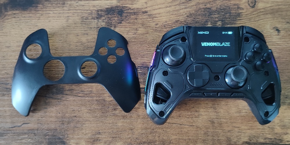 Yaxo Venom Blaze już na pierwszy rzut oka prezentuje się nowocześnie i solidnie. Producent postawił na agresywną, lekko kanciastą linię obudowy, która nadaje całości gamingowy charakter. Matowe wykończenie w połączeniu z błyszczącymi akcentami sprawia, że kontroler wygląda elegancko, a jednocześnie nie zbiera nadmiernie odcisków palców. Na środku znalazł się wyróżniający element – ekran, który od razu przyciąga uwagę i odróżnia ten model od konkurencji. Całość uzupełniają charakterystyczny krzyżak, asymetryczny układ gałek analogowych i subtelne logo producenta. Nie ma się tutaj do czego przyczepić. Całkiem nieźle wygląda też podświetlenie LED, na bokach kontrolera – jest subtelne i bardzo dobrze wpisuje się w całą stylistykę.