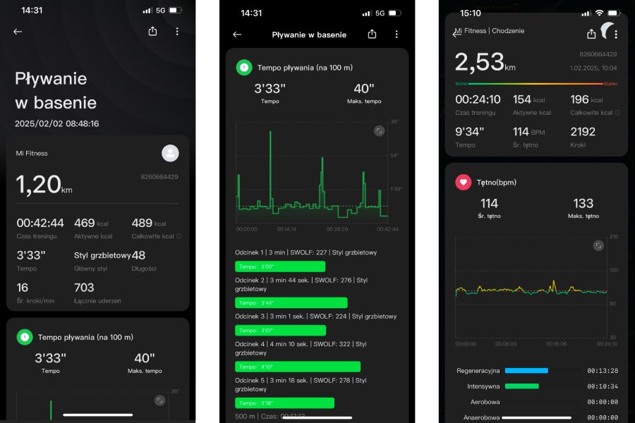 Ja przepłynąłem z nim ponad kilometr podczas jednego treningu i spisał się bez zarzutu. Podczas pływania mogłem na bieżąco śledzić najważniejsze informacje, takie jak dystans, ilość przepłyniętych basenów czy spalonych kalorii, a po zakończeniu treningu, czy to na zegarku, czy w aplikacji Mi Fitness, sprawdzić dokładnie na wykresach tempo, częstotliwość uderzeń czy SWOLF (wskaźnik efektywności pływania). Jak po każdym treningu otrzymałem także Ocenę witalności, która mierzy pozytywny wpływ aktywności fizycznej na zdrowie. Naszą ogólną ocenę witalności możemy na bieżąco śledzić w aplikacji bądź w smartwatchu i na jej podstawie analizować, czy robimy wystarczająco dużo, aby zachować formę, a tym samym bardziej świadomie planować treningi.