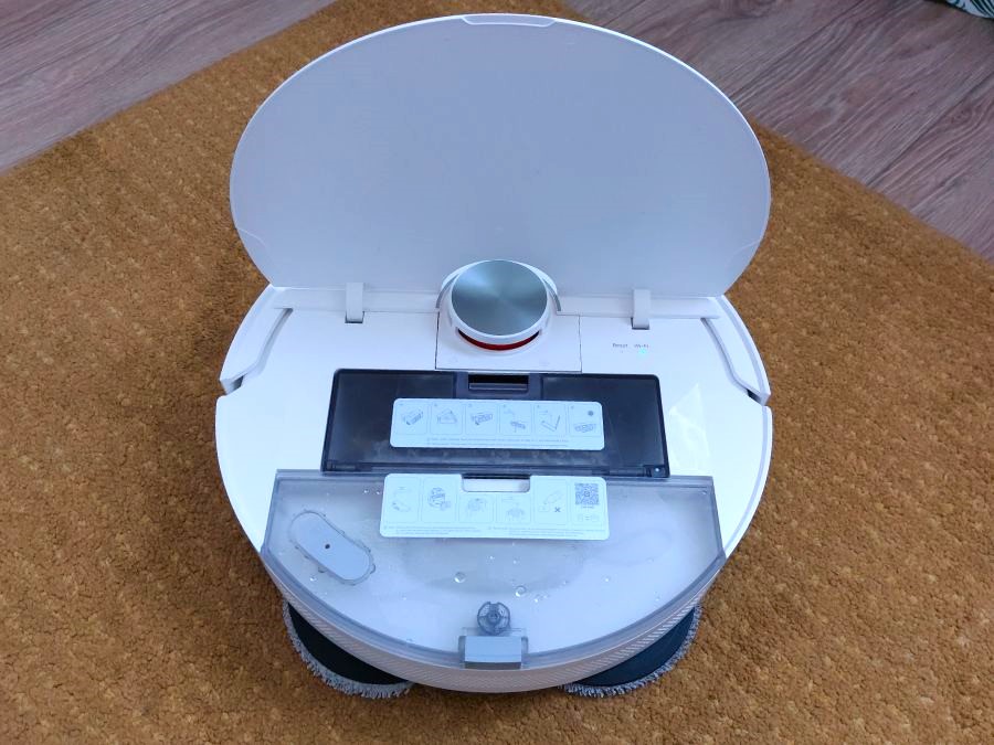 Od góry dostępne są też pojemnik na kurz (spory, o pojemności 450 ml, wyposażony w filtr powietrza) i zbiornik na wodę (jego pojemność to 290 ml). Schowane są pod pokrywą, którą wystarczy unieść, by się do nich dostać. Pod pokrywą znajdziesz też przycisk resetowania i wskaźnik Wi-Fi.