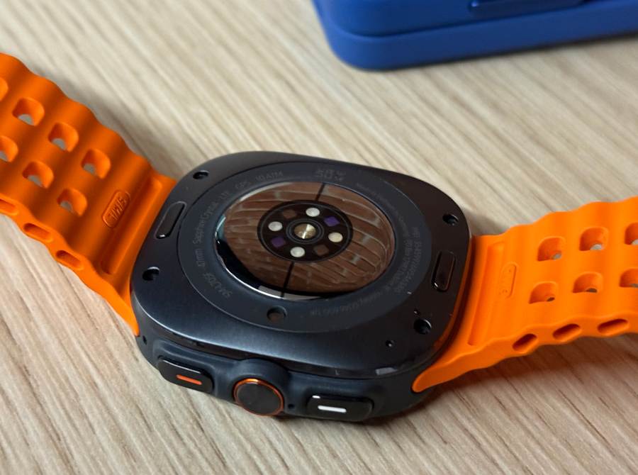 W przypadku testowanej przeze mnie wersji Galaxy Watch Ultra w kolorze szarym (a dokładnie ciemnoszarym czy wręcz grafitowym) pasek ma kolor pomarańczowy, dzięki czemu tworzy idealne zestawienie kolorystyczne z zegarkiem.