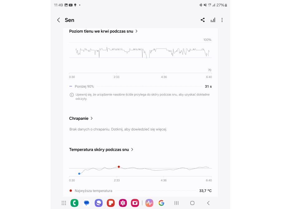Nie zabrakło także zaawansowanej analizy snu. Zapewnia ona wiele szczegółowych informacji. W tym o: fazach snu, poziomie tlenu podczas snu, częstości oddechów czy temperaturze skóry. Możemy dowiedzieć się także, czy chrapiemy (i co z tym zrobić), a także czy mamy objawy niebezpiecznego dla zdrowia bezdechu sennego. Dostaniemy też informacje o czynnikach wpływających na sen, a także porady, co robić, żeby polepszyć jego jakość.