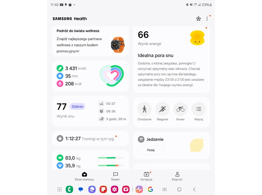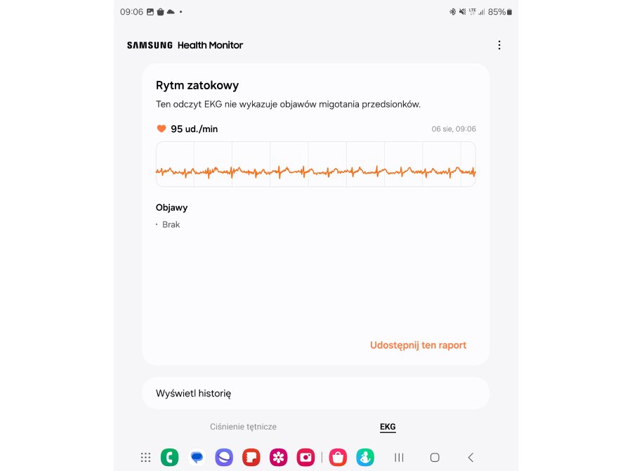 Warto też mieć na uwadze, że ten najmocniejszy ze smartwatchy Samsung pokazuje pełnię możliwości ze smartfonami z ekosystemu Galaxy. Tylko w tym przypadku można korzystać z funkcji Galaxy AI, czyli wyniku energetycznego i propozycji odpowiedzi na wiadomości, gestu podwójnego szczypnięcia, EKG czy wykrywania bezdechu sennego i powiadamiania o nieregularnym rytmie serca.