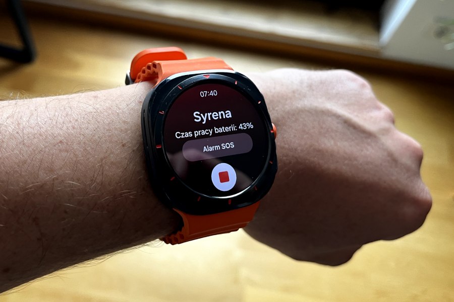 Galaxy Watch Ultra wyposażono w aż trzy przyciski – w tym, jak nazywa go Samsung, szybki przycisk. Po jego wciśnięciu błyskawicznie przechodzimy do aplikacji z wyborem treningów (jeśli jednak chcemy, to w ustawieniach możemy przypisać mu inną funkcję). Z kolei naciśnięcie i przytrzymanie szybkiego przycisku przez 5 sekund uruchomi syrenę alarmową, co zwiększa nasze szanse na nadejście pomocy, jeśli coś złego zacznie się z nami dziać w słabo zaludnionym terenie. Wydaje ona dźwięk o głośności do 86 dB i zasięgu do 180 m.