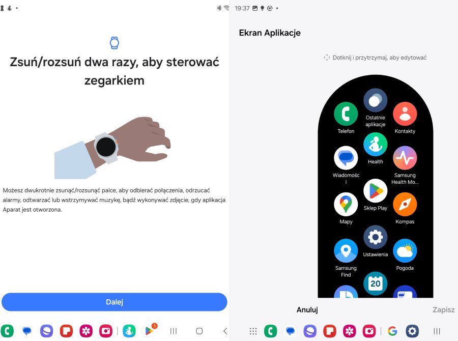 Jeśli chodzi o wspomniane wyżej gesty, to oprócz znanych już z poprzednich modeli Galaxy Watch –Potrząśnij, aby odrzucić oraz Pukania – najmocniejszy inteligentny zegarek Samsung może reagować teraz także na gest szybkiego zsunięcia i rozsunięcia palca wskazującego oraz kciuka. W ten sposób możemy np. odebrać połączenie, wyłączyć minutnik/alarm czy uruchomić migawkę w aparacie telefonu (działa tylko ze smartfonami Samsung, np. Galaxy Z Fold6, którego test również dla was przygotowałem).