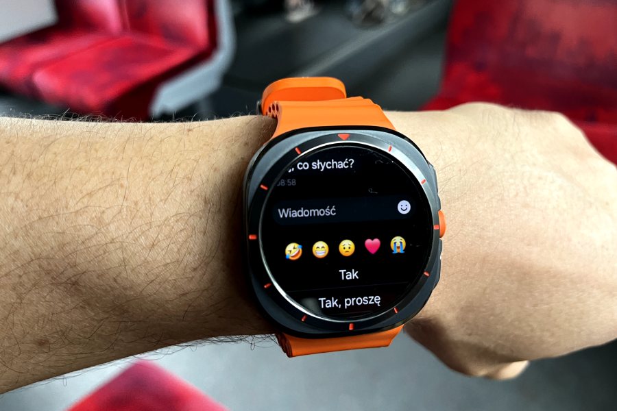 A jak już jesteśmy przy smartfonach, to oczywiście Galaxy Watch Ultra obsługuje powiadomienia z zainstalowanych na nich aplikacji. W przypadku odpowiedzi na otrzymane wiadomości smartwatch korzysta ze wsparcia sztucznej inteligencji – analizuje ona poprzednie rozmowy i na ich podstawie przygotowuje gotowe propozycje. Możliwe jest także głosowe podyktowanie odpowiedzi, która następnie zostanie zamieniona na tekst, jak również odbieranie i wykonywanie połączeń z poziomu zegarka.