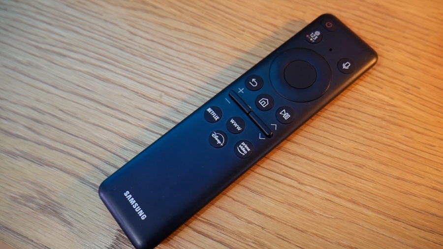 Pilot, który znajduje się w zestawie, powinien być dobrze znany użytkownikom telewizorów Samsung. Niewielki, z bardzo wygodnie rozmieszczonymi przyciskami, pozwala w łatwy sposób sterować każdą funkcją telewizora. Ma wbudowaną baterię – można go ładować albo za pomocą kabla USB-C, albo korzystając z panelu na światło słoneczne umieszczonego na spodzie akcesorium.