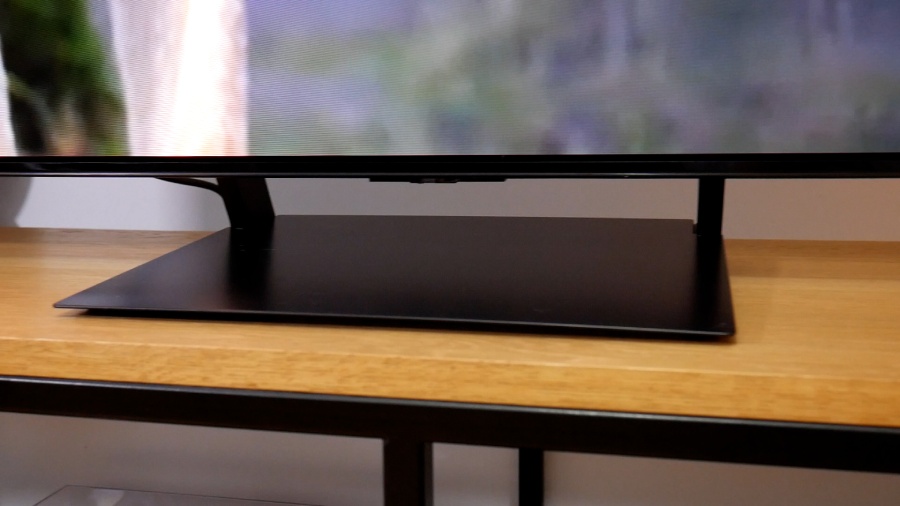 Nowoczesność, minimalizm i dobry styl – to cechy designu Samsung OLED S90C. Trzeba przyznać, że jego wygląd zewnętrzny może zachwycić. Duża i niesamowicie smukła matryca prezentuje się jak sprzęt z przyszłości. Jej grubość to zaledwie kilka milimetrów, jedynie w dolnej części z tyłu urządzenia widać niewielkie wybrzuszenie, w którym znalazły się cała elektronika i złącza. Konstrukcję utrzymuje spora podstawka – na tyle wysoka, że pozwala przed telewizorem postawić np. soundbar.