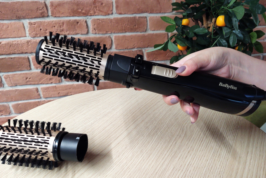 Jeśli jednak należysz do grona tych osób, które wolą krótsze przewody, nie będziesz mieć z nim problemu: można go wygodnie ujarzmić specjalną dołączoną przez producenta trytytką. Wszystkie zamieszczone na rękojeści przyciski wydają się intuicyjne w obsłudze. Duży przesuwny przycisk odpowiada za włączenie urządzenia i zmianę temperatury (wyższej lub niższej, w zależności od tego, czy mamy cienkie, czy grube włosy), a dwa umieszczone na szczycie guziki ze strzałkami – za uruchomienie kręcenia się szczotki w wybranym kierunku, co pozwala na stworzenie odmiennych stylizacji. Całość skrywa w sobie 1000 W mocy.