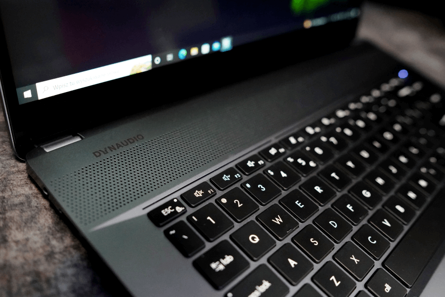 Świetnie prezentuje się także głośnik. Jest on rozciągnięty nad klawiaturą wzdłuż ekranu i zapewnia bardzo fajne brzmienie. Nie odczuwałem potrzeby podpięcia dodatkowych głośników podczas oglądania „Gwiezdnych wojen” – więc jest naprawdę w porządku. Odpowiadają za to 4 głośniki 2 W Stereo Speakers w systemie Dynaudio. Dźwięk był czysty, a basy oraz wokal – bardzo wyraźne.