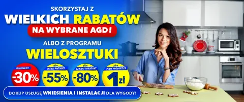 Szukasz lodówki w dobrej cenie? A może potrzebna Ci nowoczesna pralka z dużą pojemnością lub pralko-suszarka z funkcją pary? Znajdziesz u nas także suszarki do prania objęte rabatami, które pozwolą Ci oszczędzić czas i energię. Uzupełnij swoją kuchnię – obniżkami objęliśmy m.in. zmywarki wolnostojące, kuchenki mikrofalowe, okapy kuchenne, a także praktyczne kuchenki wolnostojące. Nie zabrakło też obniżonych cen na zamrażarki idealne do przechowywania większej ilości żywności oraz armaturę kuchenną, która świetnie uzupełni całą aranżację.