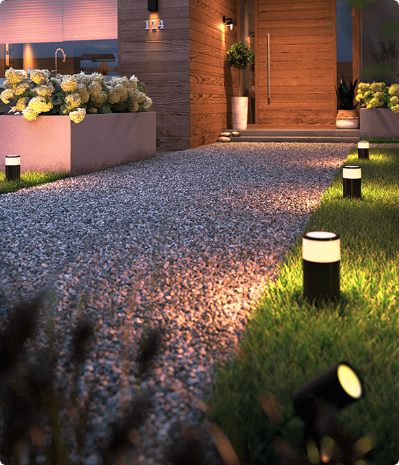 Produkty Philips Hue są wykonane z najwyższej jakości materiałów odpornych na wilgoć i działanie warunków atmosferycznych. Możesz mieć więc pewność, że oświetlenie ogrodowe Philips Hue jest w pełni bezpieczne i trwałe.