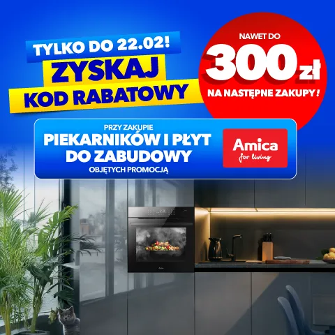 „Zyskaj kod rabatowy do 300zł na kolejne zakupy przy zakupie wybranych płyt i piekarników Amica” obowiązuje w sklepach RTV EURO AGD i na euro.com.pl (z wyłączeniem outletów) w dniach od 09.02.2026r. do 22.02.2026r. lub do wcześniejszego wyczerpania się asortymentu. Obejmuje wybrany asortyment. Wartość Kodu zależy od modelu zakupionego produktu przy czym maksymalnie jest to 300 zł. Kod będzie ważny 3 miesiące od dnia przekazania (tj. od 30.03.2026 r., z zastrzeżeniem procedury weryfikacji). Kod upoważnia do uzyskania obniżki ceny kupowanych Towarów, Treści cyfrowych i Usług cyfrowych objętych Kodem i w okresie ważności Kodu można go używać wielokrotnie do wyczerpania jego wartości. Szczegóły, w tym warunki korzystania z Kodu i zasady łączenia się kodów rabatowych, w Regulaminie w sklepach i na euro.com.pl. Zapoznaj się z regulaminem. Zapoznaj się z regulaminem.