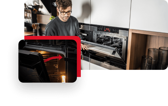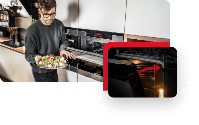 W codziennym przygotowywaniu pysznych posiłków bywa tak, że obie ręce masz zajęte, np. blachą z pyszną zapiekanką. Jak w takiej sytuacji otworzyć drzwi piekarnika? Uratuje Cię funkcja OpenUp!® – Automatyczne otwieranie drzwi. Wystarczy, że dotkniesz frontu urządzenia łokciem, aby zyskać komfortowy dostęp do komory urządzenia.