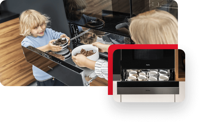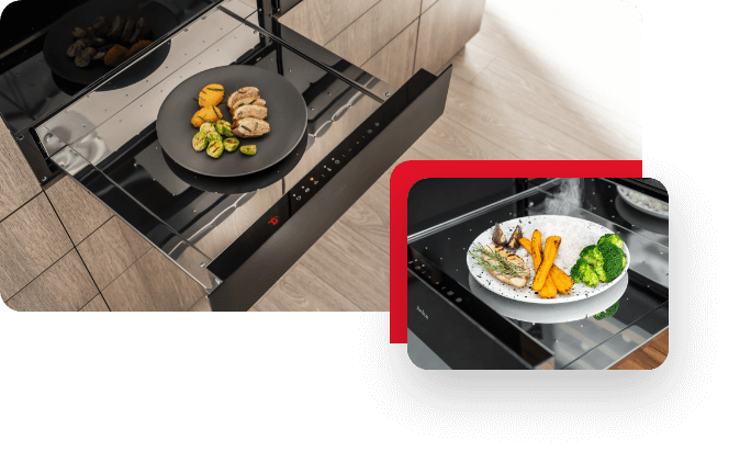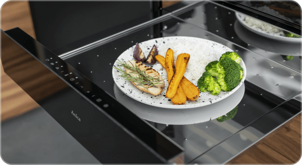 W szufladach grzejnych nie tylko przygotujesz sos czekoladowy czy deser jogurtowy, ale też utrzymasz temperaturę przygotowanych dań na wypadek, gdyby Twoi gości mieli lekkie opóźnienie.