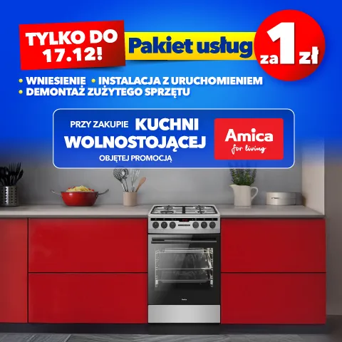 Promocja obowiązuje w sklepach RTV EURO AGD w godzinach ich otwarcia oraz na euro.com.pl (z wyłączeniem outletów) od: 08.12.2025 r. od godz. 10:00 do 22.12.2025 r. godz. 23.45 lub do wcześniejszego wyczerpania się asortymentu. Obejmuje wybrane kuchnie wolnostojące Amica. Klient przy zakupie kuchni wolnostojącej Amica może nabyć usługę za 1 zł. Szczegóły w Regulaminie dostępnym w sklepach i na euro.com.pl. Zapoznaj się z regulaminem.