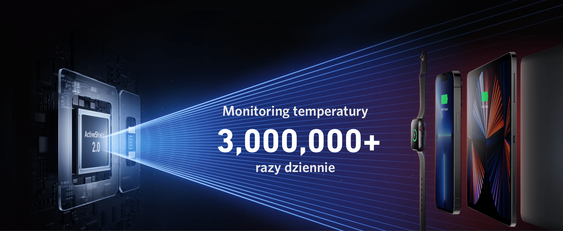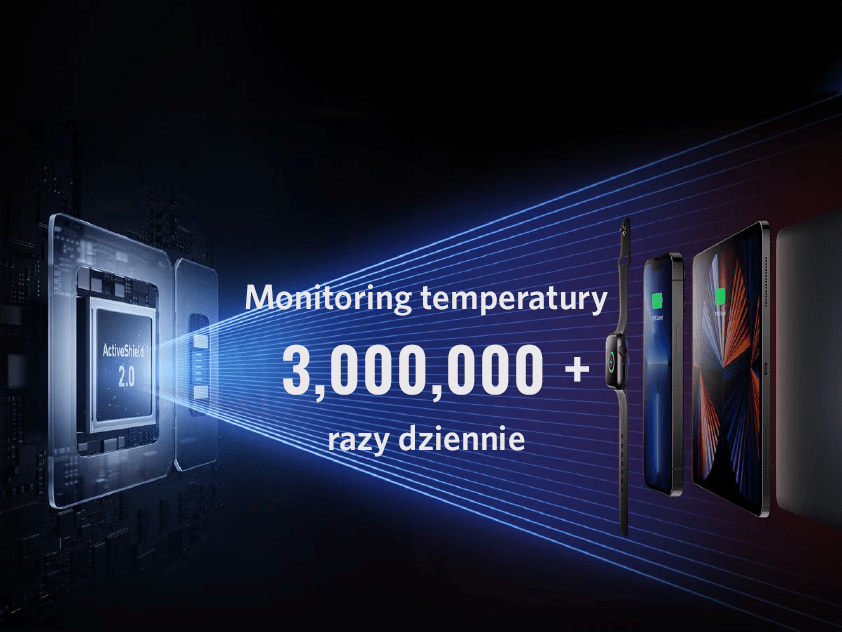 To zaawansowany system ochrony stosowany w urządzeniach Anker. ActiveShield 2.0 monitoruje temperaturę urządzenia ponad 3 miliony razy dziennie. Dzięki temu może dynamiczne dostosowywać moc wyjściową w celu ochrony podłączonych urządzeń przed przegrzaniem i nadmiernym poborem prądu.