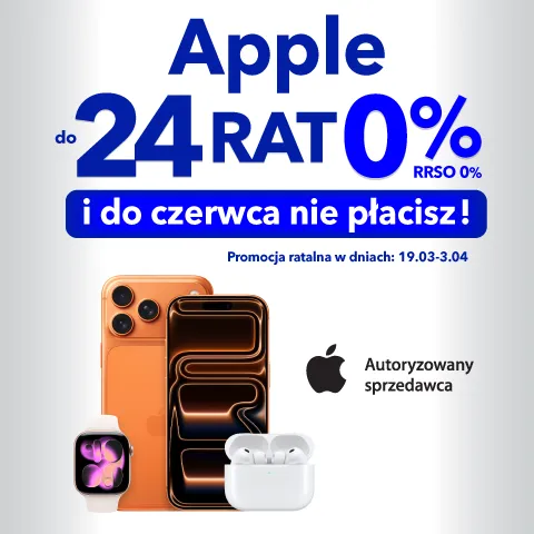 Promocja ratalna „Do 24 rat 0% na wszystkie towary Apple i do czerwca nie płacisz! RRSO 0%" obowiązuje od 19.03.2026 r. do 3.04.2026 r. Promocja obejmuje też usługi kupione łącznie z towarem objętym promocją. Wartość kredytu od 300 do 30 000 zł. Reprezentatywny przykład dla ceny towaru 4872 zł: Rzeczywista Roczna Stopa Oprocentowania (RRSO) wynosi 0%; całkowita kwota kredytu (bez kredytowanych kosztów) 4872 zł; całkowita kwota do zapłaty 4872 zł; stała stopa oprocentowania 0%; całkowity koszt kredytu 0 zł; czas obowiązywania umowy 26 miesięcy dla umów zawartych 19-31.03.2026 r., 25 miesięcy dla 1-3.04.2026 r.; liczba rat 24; wysokość raty 203 zł. Kredytu udziela bank współpracujący z Euro-net Sp. z o.o. (na dzień 5.01.2026 r.: Alior Bank, Credit Agricole Bank Polska, Bank Millennium, BNP Paribas Bank Polska). Euro-net Sp. z o.o. pośredniczy w udzielaniu kredytów oraz przyjmowaniu oświadczeń o odstąpieniu od umów kredytu. Szczegóły, w tym Regulamin, w sklepach i na www.euro.com.pl Zapoznaj się z regulaminem.