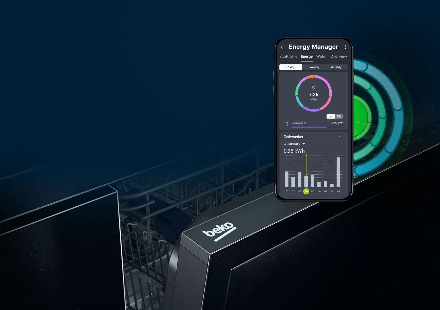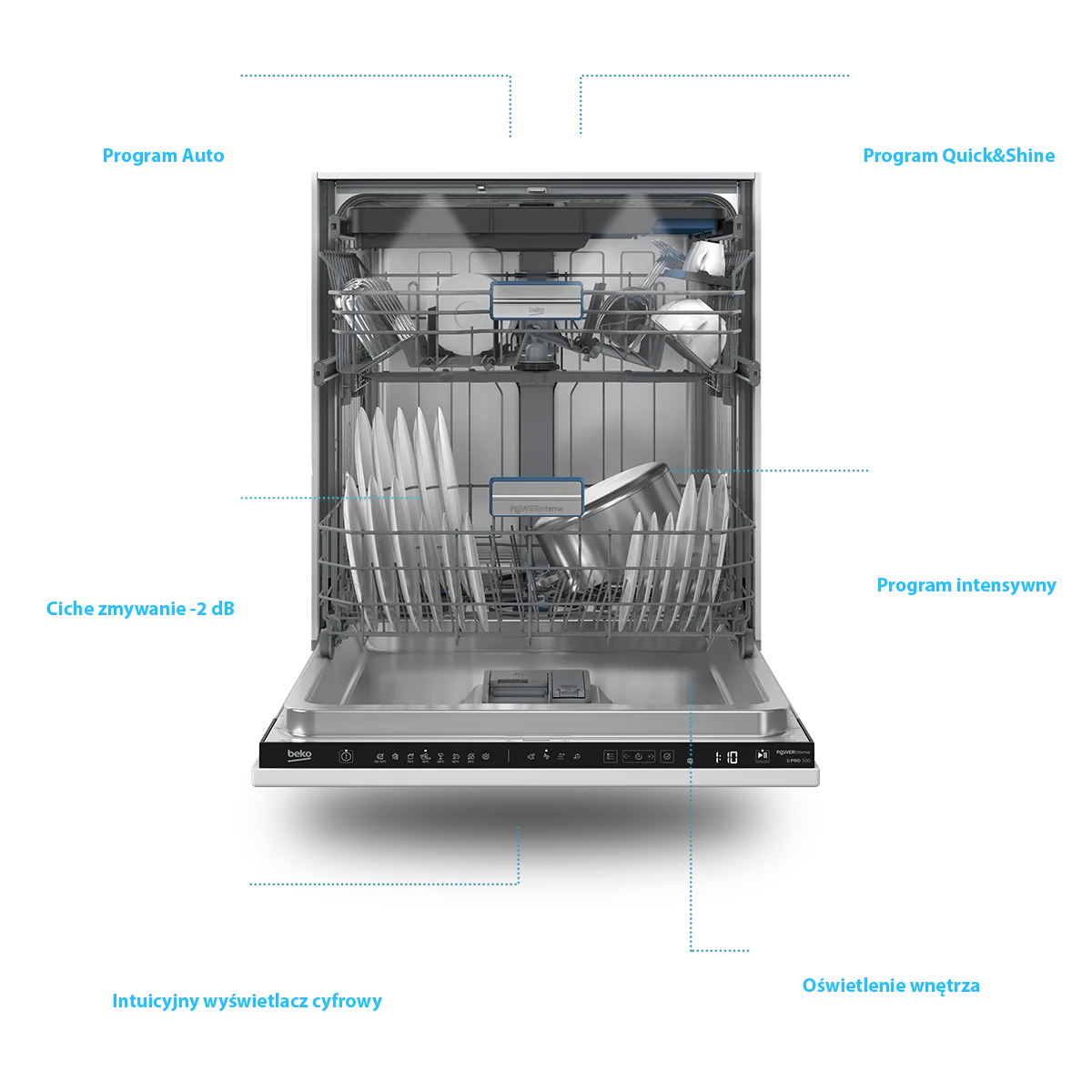To wygodna i intuicyjna kontrola pracy zmywarki Funkcja CycleTrack pozwala śledzić etap cyklu zmywania na bieżąco – bez potrzeby otwierania drzwi zmywarki. LedSpot natomiast rzuca delikatne światło na podłogę, informując, że urządzenie jest w trakcie pracy, co jest szczególnie przydatne w cichych modelach.Funkcje w zmywarkach Beko
