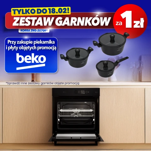 Promocja obowiązuje w sklepach RTV EURO AGD oraz na euro.com.pl (z wyłączeniem outletów) od: 29.01.2026 r. od godz. 15:00 do: 18.02.2026 r. do godz. 23:45 lub do wcześniejszego wyczerpania się asortymentu. Obejmuje wybrane płyty indukcyjne i wybrane piekarniki marki Beko oraz wybrane zestawy garnków. Klient przy zakupie płyty indukcyjnej wraz z piekarnikiem może nabyć zestaw garnków za 1 zł. Szczegóły promocji, w tym zasady jej łączenia się z innymi promocjami, w Regulaminie w sklepach i na euro.com.pl. Zapoznaj się z regulaminem.