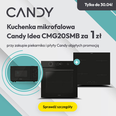 "Przy zakupie piekarnika i płyty indukcyjnej objętych promocją, kuchenka mikrofalowa Candy Idea CMG20SMB Grill za 1 zł" obowiązuje w sklepach RTV EURO AGD oraz na euro.com.pl (z wyłączeniem outletów) od 07.04.2026 r. od godz. 10:00 lub do wcześniejszego wyczerpania się liczby produktów promocyjnych (kuchenek mikrofalowych). Obejmuje wybrane piekarnik do zabudowy i płyty do zabudowy marki Candy. Klient przy zakupie dwóch, objętych Promocją produktów z różnych grup produktowych (piekarnika i płyty) może nabyć objętą promocją kuchenkę mikrofalową za 1 zł. Szczegóły promocji, w tym zasady jej łączenia się z innymi promocjami w Regulaminie w sklepach i na euro.com.pl. Zapoznaj się z regulaminem.