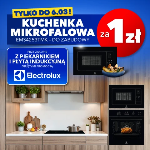 "Kuchenka mikrofalowa Electrolux EMS4253TMK za 1 zł przy zakupiepiekarnika i płyty indukcyjnej - promocja na wybrane produkty marki Electrolux" obowiązuje w sklepach RTV EURO AGD oraz na euro.com.pl (z wyłączeniem outletów) od: 20.02.2026 r. od godz. 10:00 do: 06.03.2026 r. do godz. 23.45 lub do wcześniejszego wyczerpania się asortymentu. Obejmuje wybrane produkty marki Electrolux. Klient przy zakupie piekarnika i płyty indukcyjnej objętych promocją może nabyć kuchenkę mikrofalową za 1 zł. Szczegóły promocji, w tym zasady jej łączenia się z innymi promocjami, w Regulaminie w sklepach RTV EURO AGD i na euro.com.pl.