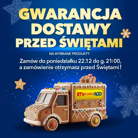 „Gwarancja dostawy przed Świętami - promocja na wybrane produkty” obowiązuje w sklepach RTV EURO AGD w godzinach ich otwarcia oraz na euro.com.pl (z wyłączeniem outletów) od: 16.12.2025r. od godz. 09:00 do: 22.12.2025r. do godz. 21.00 lub do wcześniejszego wyczerpania się asortymentu. Polega na tym, że w przypadku zakupu lub rezerwacji Towaru objętego promocją do 22.12.2025r. do godz. 21.00 na zasadach określonych w Regulaminie, dostawa takiego Towaru nastąpi do dnia 23.12.2025r. do g. 22.00, a w przypadku gdy termin dostawy nie zostanie zachowany Klient uprawniony będzie do otrzymania Karty Podarunkowej Euro o wartości 50 zł (ważnej 3 miesiące od dnia jej przekazania). Szczegóły i ograniczenia w Regulaminie Promocji Gwarancja Dostawy Mikolaj
