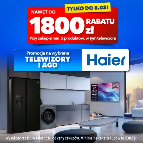„Zyskaj nawet 1800 zł przy zakupie wybranego TV i AGD – promocja na wybrane produkty marki Haier” obowiązuje w sklepach RTV EURO AGD oraz na euro.com.pl (z wyłączeniem outletów) od: 19.02.2026 r. od 10:00 do: 08.03.206 r. do godz. 23.45 lub do wcześniejszego wyczerpania się asortymentu. Obejmuje wybrany asortyment. Wysokość rabatu zależy od łącznej ceny zakupionych produktów objętych promocją. Maksymalny rabat to 1800 zł przy zakupach za min. 12500 zł. Szczegóły promocji, w tym zasady jej łączenia się z innymi promocjami, w Regulaminie w sklepach RTV EURO AGD i na euro.com.pl.