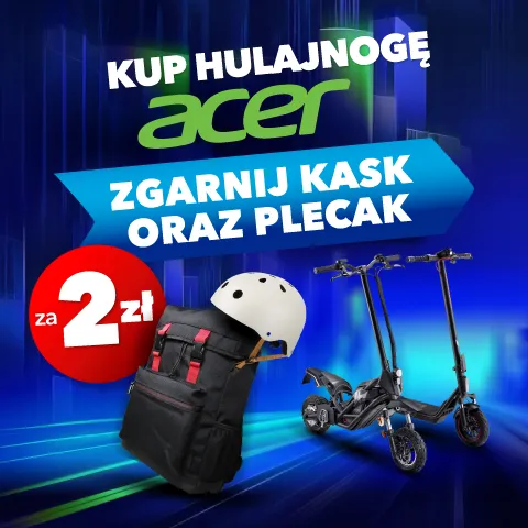 "Przy zakupie hulajnogi objętej promocją, plecak oraz kask łącznie za 2 zł – promocja na wybrane produkty" obowiązuje w sklepach RTV EURO AGD oraz na euro.com.pl (z wyłączeniem outletów) od: 24.11.2025 r. do: 10:00 do 07.12.2025 r. do godz. 23.45 lub do wcześniejszego wyczerpania się asortymentu. Obejmuje wybrane hulajnogi marki Acer. Klient przy zakupie hulajnogi objętej promocją może nabyć objęty promocją kask i plecak na laptopa Acer Nitro Gaming Multi-Functional 17 za 1 zł każdy (łącznie za 2 zł). Szczegóły promocji, w tym zasady jej łączenia się z innymi promocjami, w Regulaminie w sklepach i na euro.com.pl. Zapoznaj się z regulaminem.