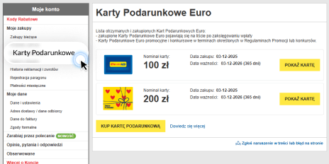 Karta Podarunkowa Euro w formie cyfrowej znajdować się będzie w Koncie Klienta. W przypadku zakupu w sklepie