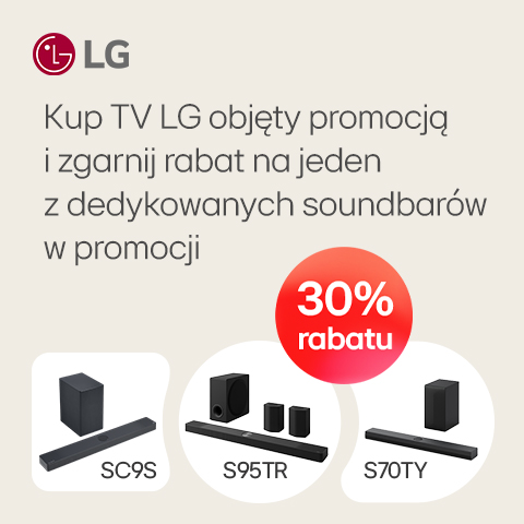 Promocja obowiązuje w sklepach RTV EURO AGD oraz na euro.com.pl (z wyłączeniem outletów) od: 06.02.2026 r. od godz.: 15:00 do: 28.02.2026 r. do godz. 23:45 lub do wcześniejszego wyczerpania się asortymentu. Obejmuje wybrane telewizory marki LG. Klient przy zakupie telewizora objętego promocją może nabyć dedykowany soundbar z rabatem 30%. Wysokość rabatu zależy od wybranego modelu soundabra. Szczegóły promocji, w tym zasady jej łączenia się z innymi promocjami, w Regulaminie w sklepach RTV EURO AGD i na euro.com.pl. Zapoznaj się z regulaminem.