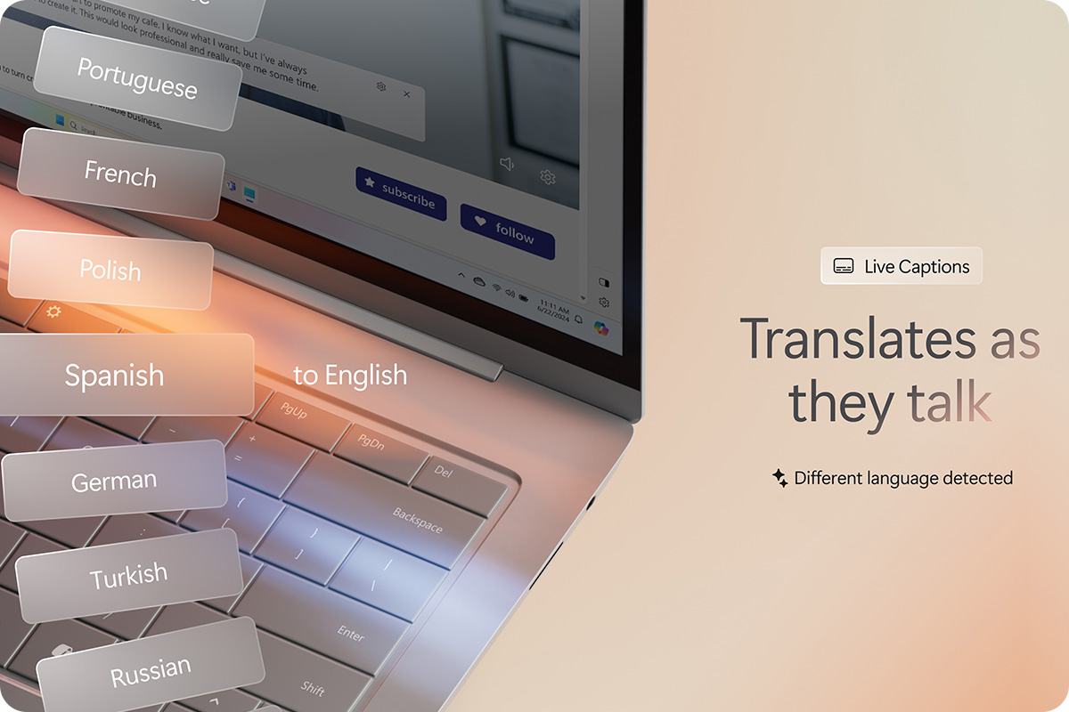 Każda rozmowa może być szansą na nawiązanie prawdziwej więzi. Pokaż się z najlepszej strony dzięki efektom Studia Windows i uchwyć każde wypowiedziane słowo dzięki przetłumaczonym napisom na żywo.4