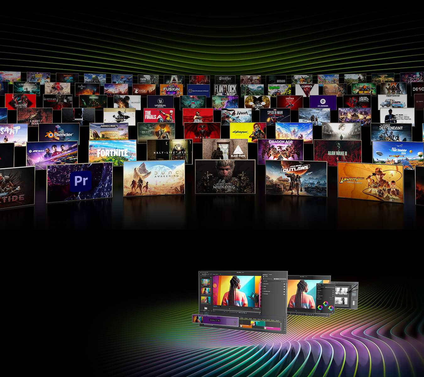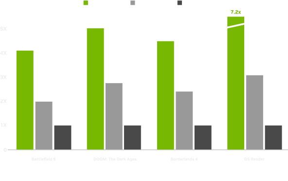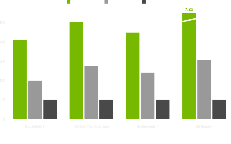 1440p, DLSS Super Resolution i rekonstrukcja promieni DLSS w seriach 30, 40 i 50, generowanie klatek na serii 40. Generowanie wielu klatek (MFG, tryb 4x) na serii 50. Battlefield 6 z ustawieniami Overkill, DOOM: The Dark Ages z ustawieniami Ultra, Borderlands 4 z ustawieniami Badass.