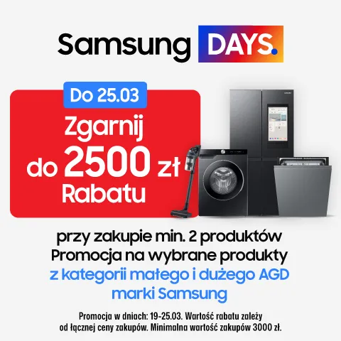 Promocja obowiązuje w sklepach RTV EURO AGD oraz na euro.com.pl (z wyłączeniem outletów) od: 19.03.2025 r. od godz. 10.00 do: 25.03.2026 r. do godz. 23.45 lub do wcześniejszego wyczerpania się asortymentu. Obejmuje wybrane produkty z kategorii małego i dużego AGD marki Samsung. Wartość rabatu zależy od łącznej ceny zakupionych, co najmniej dwóch różnych produktów objętych promocją z różnych grup produktowych. Maksymalny rabat to 2500 zł przy zakupach za min. 15000 zł. Minimalny rabat to 300 przy zakupach za min. 3000 zł. Szczegóły promocji, w tym zasady jej łączenia się z innymi promocjami, w Regulaminie w sklepach i na euro.com.pl.