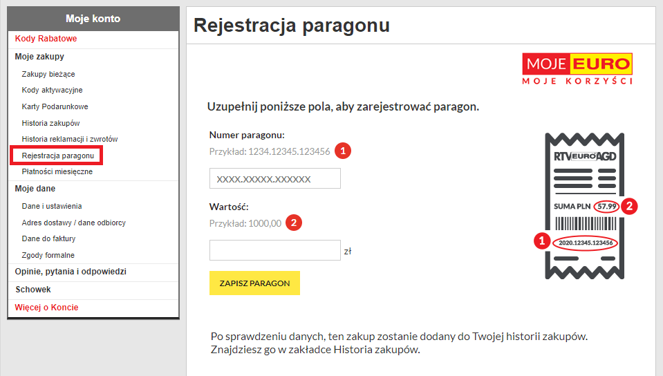 Aby zarejestrować paragon, należy zalogować się na konto Moje Euro i kliknąć w zakładkę "Rejestracja paragonu".