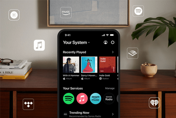 Aplikacja Sonos skupia wszystkie treści i ustawienia w jednym miejscu, umożliwiając łatwe sterowanie w dowolnym pomieszczeniu.